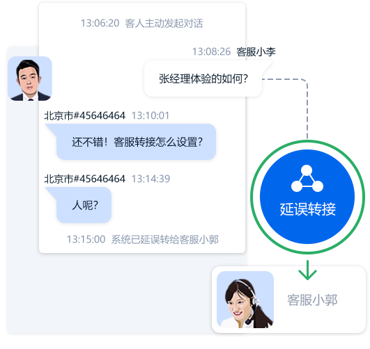 强大的延误转接功能, 保证营销对话实时流转,让客户实时感受 到接待,优化接待流程,让营销更有效。