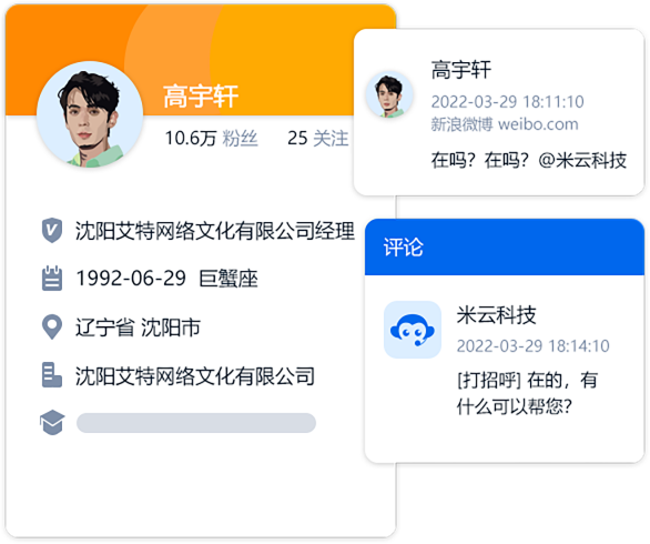 显示与您互动的微博资料:所属地区、粉丝订阅、关注、取消关注等皆有显示。实时掌握粉丝状态与互动内容,方便客服分析了解粉丝个人喜好以便后续跟进